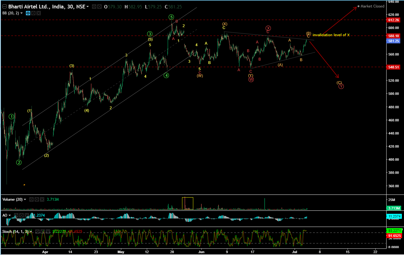Bharti Airtel Ltd (Bhartiartl - NSE) is in B wave correction of ABC zigzag of Y wave within WXY correction as double zigzag in 1 hr time frame. It is about to end B wave, but wait for confirmation in 5 min time frame, thereafter sell it for C wave down with stop loss above 588.90 for target zone of 540-20. It is choppy in price action since two months.